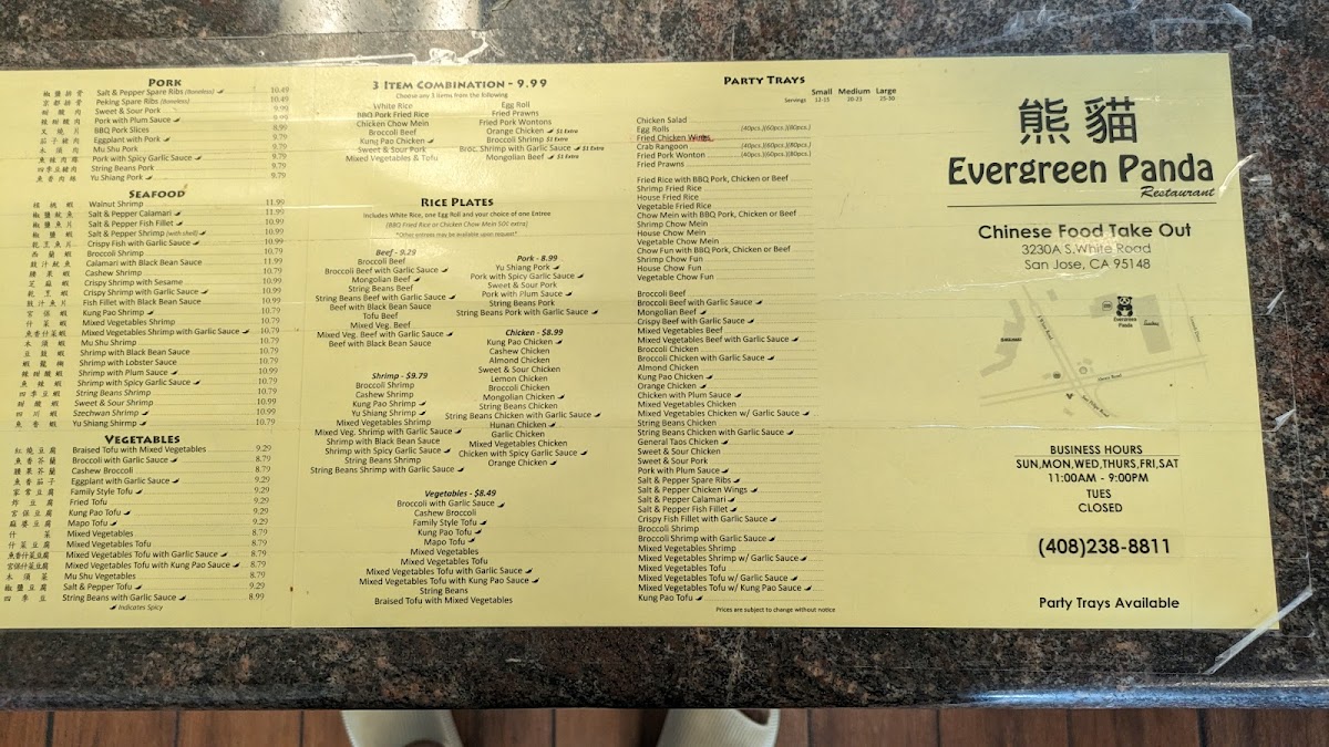 Evergreen Panda Restaurant, located at 3230 S White Rd, San Jose, is a culinary gem known for its exceptional Chinese fast food. With a menu featuring crispy Fried Prawns, flavorful Garlic Chicken, and spicy Kung Pao Chicken, this restaurant has garnered rave reviews for its remarkable flavors and generous portions. Although it operates as a takeout establishment, customers rave about the quick service and the quality of freshly cooked meals. Whether it’s the sweet and savory Peking Ribs or the satisfying Fried Rice, each dish promises an unforgettable experience that makes Evergreen Panda a must-try for food enthusiasts in the area.